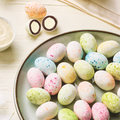Ovetti di cioccolato al latte ripieni di crema ai gusti: latte, pistacchio, crème caramel, tiramisù, vaniglia e lamponi.